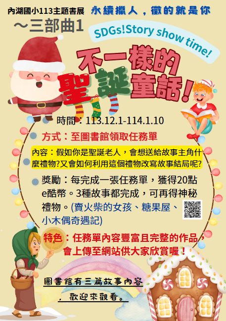 三部曲「不一樣的童話世界!/SDGs!Story show time!」, 結合小朋友喜愛的童話故事內容,挑選出三個故事:賣火柴的小女孩、小木偶奇遇記、糖果屋。並提供這三個故事相對應的SDGs目標與其圖示。寫故事哪一部分和對應的SDGs目標有關、如果你是故事主角,你希望是什麼不一樣的結局?(文字敘述或畫圖呈現皆可)、設計一顆能量球送給主角度過難關。(要從故事對應的SDGs目標圖示去變化喔!)!